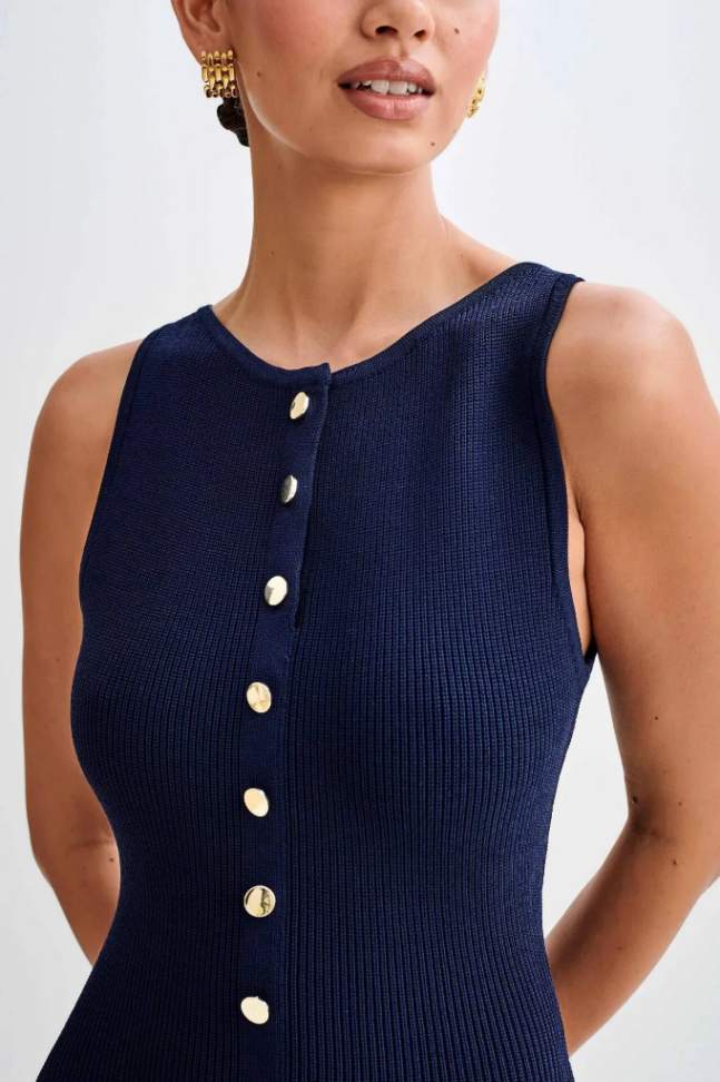 Elegância minimalista: modelo sólido e sem mangas com botões decorativos que adicionam sofisticação sem exageros.