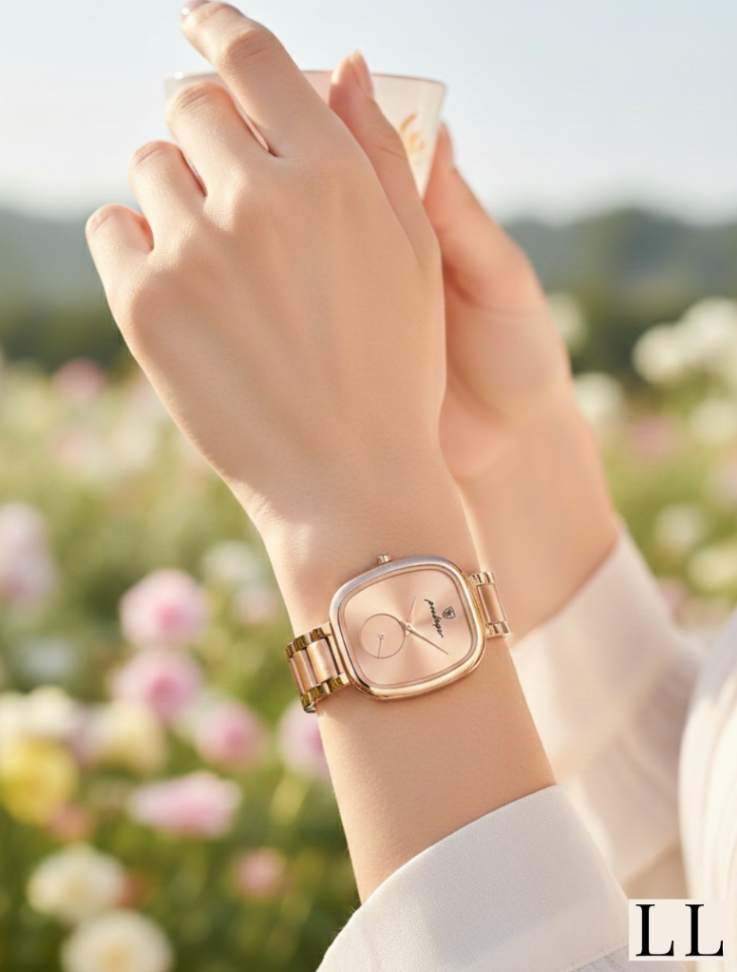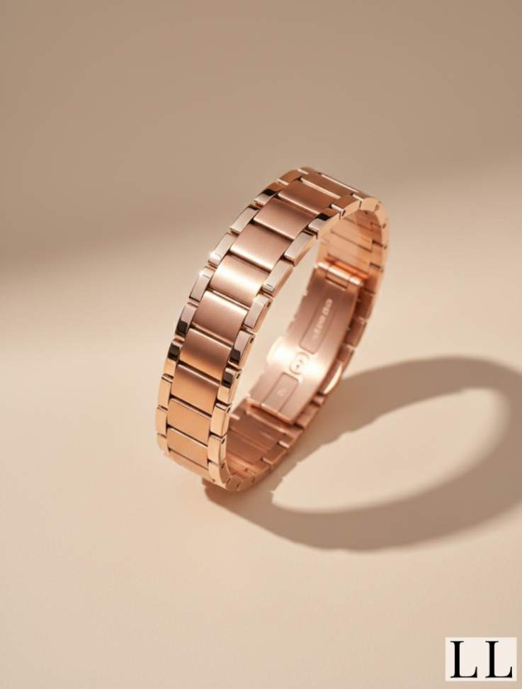 Seu tom rosé ilumina o pulso com brilho delicado — aquele que chama atenção sem precisar pedir.